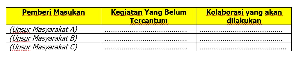 Masyarakat, melalui perwakilan yang diundang, dapat memberikan masukan yang kemudian akan dicatat dalam satu dokumen terpisah sebagai bahan untuk memperkaya rancangan RAD TPB Kab. Mimika tahun 2020-2024. Masukan tersebut diharapkan dapat berupa: