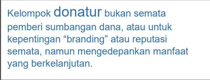 [i]Platform kemitraan ini disebut Filantropi dan Bisnis Indonesia. Kelompok donatur bukan semata pemberi sumbangan dana, atau untuk kepentingan “branding” atau reputasi semata, namun mengedepankan manfaat yang berkelanjutan.