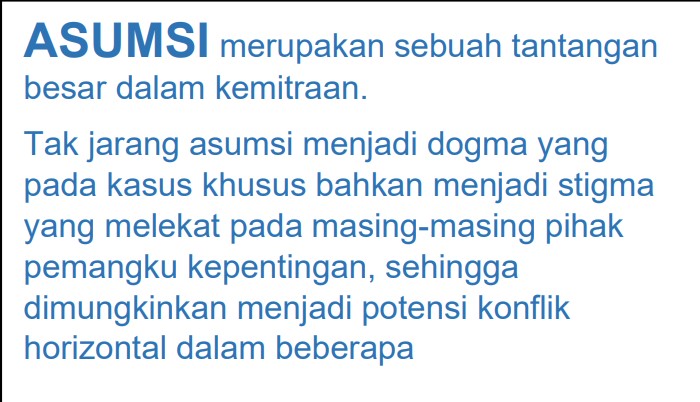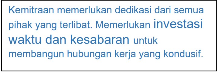 Ada tahapan/fase dalam kemitraan yang berjalan lebih lambat karena kesiapan setiap mitra yang berbeda. Misalnya peran dan tugas Pemkab dan Besipae pada tahap awal belum jelas dan belum dieksplorasi. Kondisi ini sesungguhnya adalah kesempatan untuk bekerja sama dengan cakupan tugas fungsi pokok yang lebih besar sebelum semua pihak siap untuk bermitra.