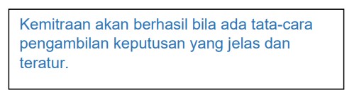 • Tujuan kemitraan ditentukan, dan masing-masing organisasi merinci apa saja yang dikontribusikan.