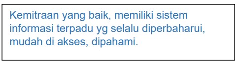 operasional yang lebih baik. Adanya sistem informasi terpadu yang dibangun bersama para mitra, dapat memberikan penguatan kelembagaan bagi setiap mitra, jika informasinya mudah diakses dan dipahami dengan mudah. Sistem informasi terpadu di masa kini, dapat menggunakan fasilitas on-line (email, website, facebook, Instagram) maupun off-line (surat kabar berkala, pertemuan-pertemuan berkala) untuk wilayah-wilayah yang belum terjangkau dengan informasi teknologi (internet).