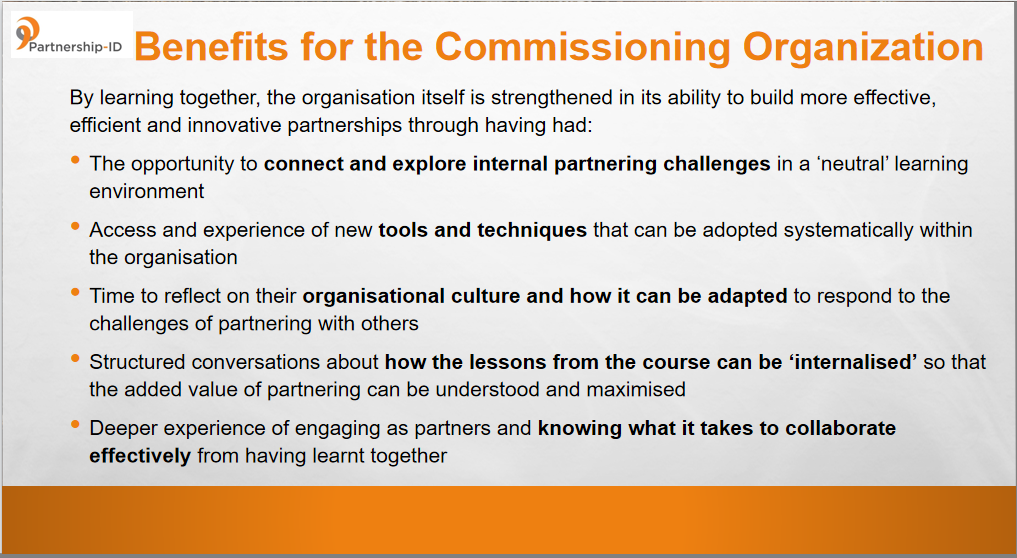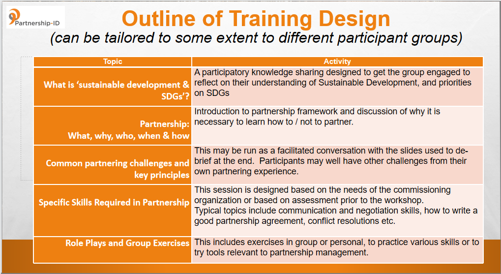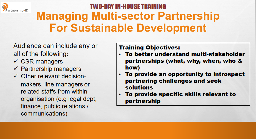 Menghindari hal-hal semacam itu, berbekal pengalaman bertahun-tahun dalam menangani program-program kemitraan di Indonesia, P-ID meluncurkan program pelatihan kemitraan yang dapat diakses secara lebih cepat dan mudah dalam bentuk “in house training” pada instansi mau pun lembaga yang berminat mendalami proses kemitraan. Berikut adalah rinciannya, dalam bentuk pelatihan dua hari bertajuk “Managing Multi-Sector Partnership for Sustainable Development”