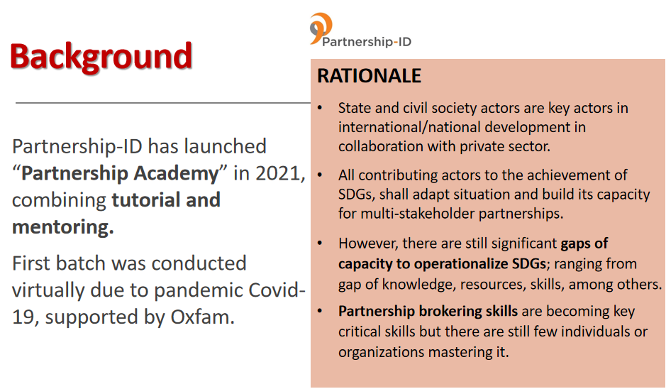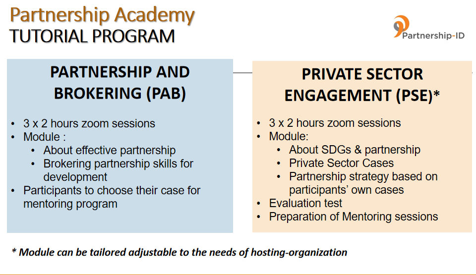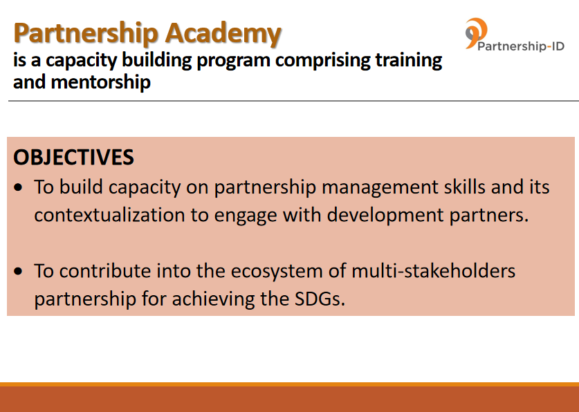 Dalam rangka meningkatkan pemahaman dan praktek-praktek brokering partnership yang profesional dan mumpuni kepada para aktor partnership di Indonesia, Partnership – ID meluncurkan program pelatihan yang komprehensif dan suportif bertitel “Partnership Academy” sejak 2021. Mengkombinasikan antara teori dan praktek serta bimbingan terstruktur yang dapat meningkatkan kompetensi dan kapasitas para partnership broker secara signifikan, pelatihan ini didisain guna memenuhi tantangan partnership yang semakin berkembang.