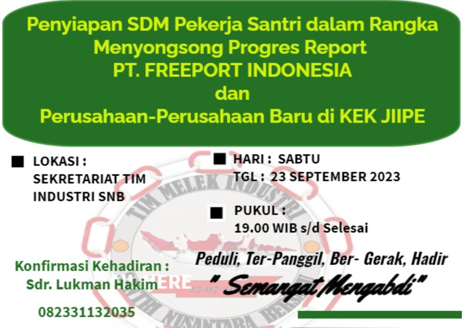 “Alhamdulillah, kegiatan ‘Ngaji Industri’ ini, sudah berjalan sampai jilid ke- 34. Kekompakan dalam satu wadah Tim Melek Industri, baik penggerak, para pekerja santri adalah kekuatan dan semangat untuk terus berbuat dengan niat kokoh supaya bisa memberi manfaat pada sesama,” ujar Ketua Panitia, Syaiful Rizal. Secara khusus Rizal, menyebut keberadaan PTFI dan perusahaan – perusahaan baru di KEK JIIPE perlu diantisipasi dengan serius “… agar para santri dapat bisa bekerja di PTFI,” tandasnya penuh semangat.
