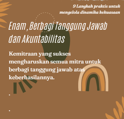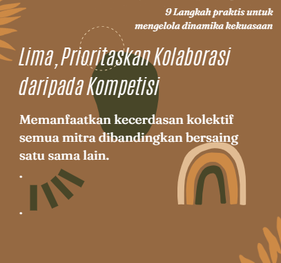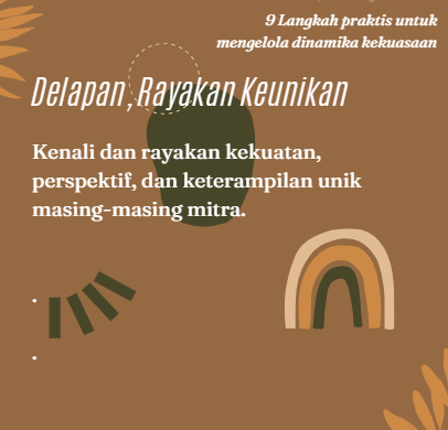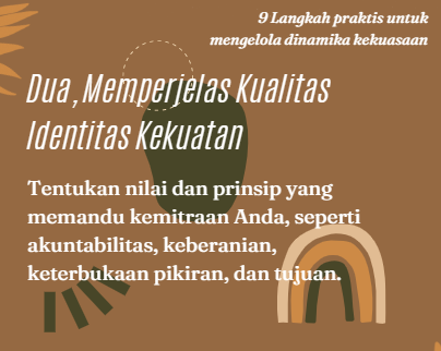 Dengan menentukan dinamika kekuasaan secara proaktif, kita dapat memupuk kemitraan yang tidak hanya berhasil namun juga adil, saling menghormati, dan transformatif. Kita perlu menentukan siapa yang akan menjadi mitra. Kita tahu, kekuatan sesungguhnya dari kemitraan terletak pada kemampuan mereka untuk memperkuat kekuatan masing-masing organisasi dan menyatukan suara yang berbeda-beda.
