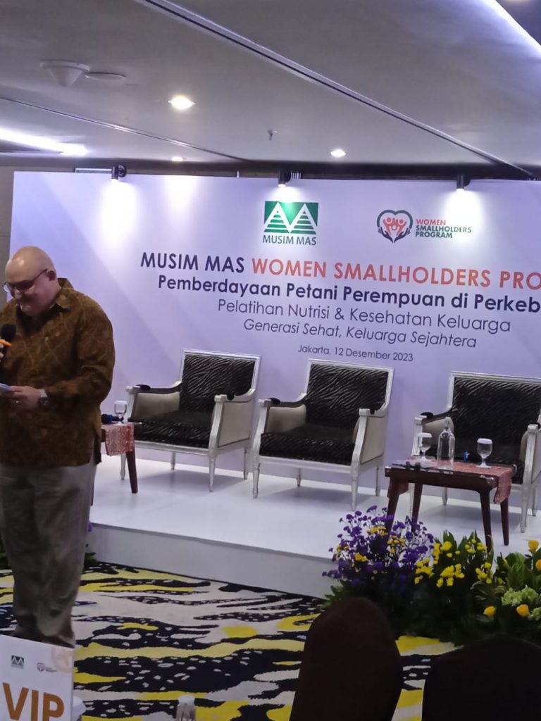 “Indonesia Raya” berkumandang membuka acara paparan publik yang digelar oleh Musim Mas dan Partnership-ID, bertempat di Grand Dika hotel, Selasa 12 Desember 2023. Dalam pengantar yang dibawakan oleh Yanti Triwadiantini dari P-ID, antara lain dijelaskan mengapa pilihan terhadap isu pemberdayaan petani perempuan di perkebunan dipilih oleh Musim Mas, tak lain karena keberadaan kaum perempuan secara jumlah dan peran, amat signifikan dalam mata rantai industri sawit. Hal ini ditekankan pula oleh Robert Nicholls (General Manager of Programs and Projects, Plantation Musim Mas) dalam sambutannya. Sebagai salah satu pemain paling menonjol dalam industri kelapa sawit, dan grup kelapa sawit besar pertama yang 100% disertifikasi oleh Roundtable for Sustainable Palm Oil (RSPO) untuk semua perkebunannya di Indonesia (2012), dan perusahaan kelapa sawit utama pertama yang diverifikasi oleh Palm Oil Innovation Group (POIG) pada 2019, Rob menegaskan bahwa dari fakta lapangan, diketahui masalah perempuan dan kaitannya dengan soal nutrisi dan kesejahteraan, cukup berpengaruh bagi industri sawit yang dikelola Musim Mas.
