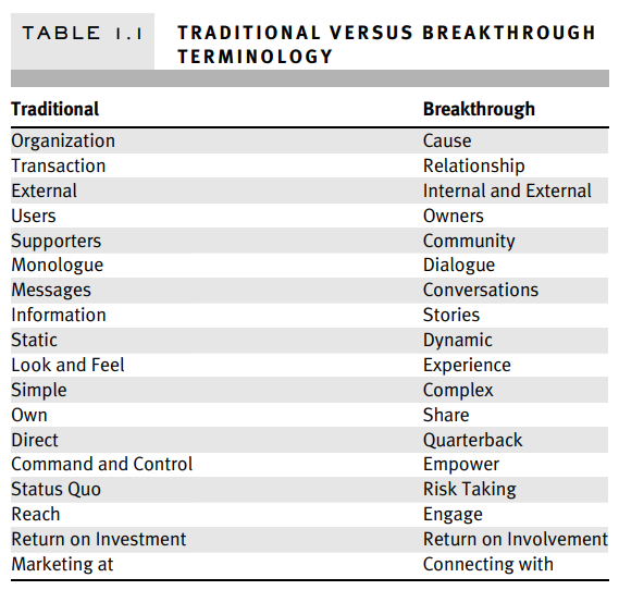 Tabel 1.1 memberikan daftar perubahan yang terjadi dalam peralihan dari praktik tradisional ke penerapan prinsip-prinsip terobosan merek nirlaba. Tujuan dari buku ini adalah untuk membekali Anda dengan wawasan dan alat untuk mencapai perubahan ini—sebuah peta jalan dari tujuh prinsip dasar yang digunakan oleh BNB. Prinsip-prinsip yang membedakan merek-merek terobosan bukan sekadar tambahan terhadap pandangan tradisional tentang merek; mereka mewakili munculnya cara berpikir yang sama sekali baru. Berikut ini adalah tinjauan singkat tentang prinsip-prinsip yang membalikkan pendekatan sebelumnya terhadap komunikasi, penggalangan dana, dan pengembangan organisasi.